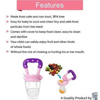 Simple to clean, hygienic, and healthy - no-choke design prevents accidental swallowing. Includes detachable food-grade silicone food pacifier bulb and infant teething toy with handle and rattle